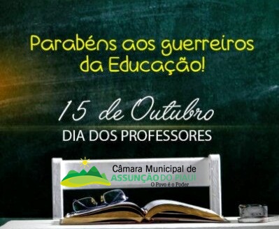 “Nesta data marcante – 15 de outubro, Dia do Professor, em nome da Cãmara Municipal de Assunção do Piauí e, em particular, quero parabenizar a todos profissionais-Professores e Professoras da Rede Municipal de Ensino, pelo dinâmico trabalho desenvolvido em prol das nossas crianças, jovens e adultos – alunos do Município de Assunção do Piauí.