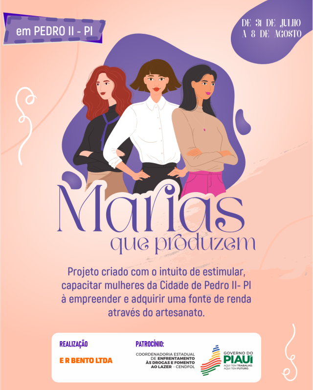 No coração de Pedro II, Piauí, um projeto inovador está trazendo esperança, capacitação e empoderamento para mulheres em situação de vulnerabilidade. A Coordenadoria de Enfrentamento Contra as Drogas e Fomento ao Lazer (CENDFOL-PI), em parceria com o Governo do Estado do Piauí e a Associação Casa das Mulheres, lançou o projeto "Marias que Produzem". Este projeto impactante ocorreu na Sede da Casa das Marias, localizada na Rua Jacob Uchôa, bairro centro, Pedro II, de 31 de julho à 08 de agosto de 2023.