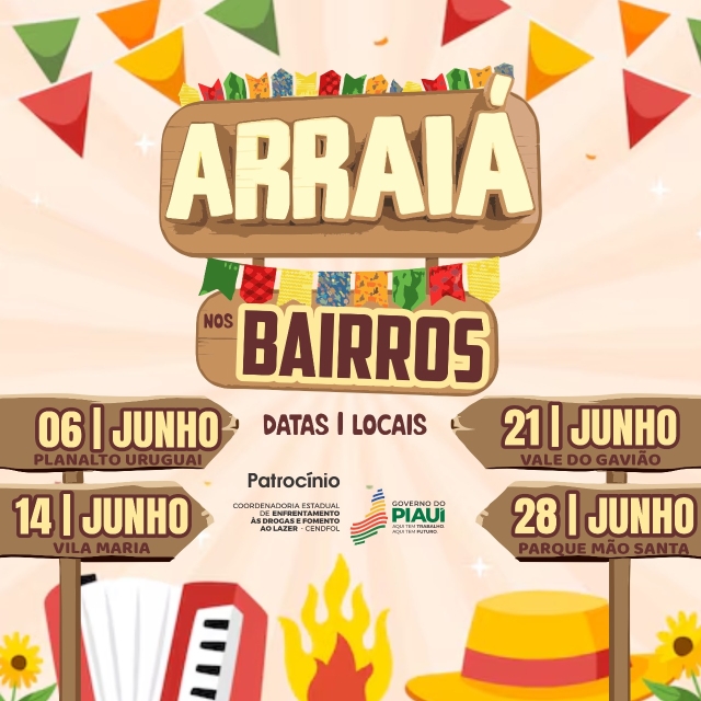 Com apoio e patrocínio do Governo do Estado, em parceria com a Coordenadoria de Enfrentamento às Drogas e Fomento ao Lazer (CENDFOL), o Arraiá nos Bairros promete uma noite inesquecível, repleta de atrações para toda a família. Os moradores do Planalto Uruguai e regiões vizinhas terão a oportunidade de prestigiar shows musicais com bandas renomadas, apresentações de quadrilhas, manifestações culturais autênticas e, claro, a irresistível culinária típica nordestina.
