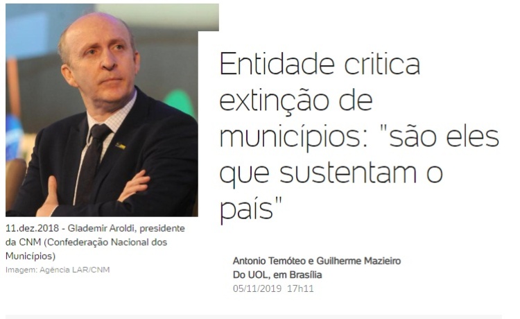 "Lamento que a gente não tenha tido o espaço para fazer o diálogo. O Município é considerado um Ente federado e é desrespeitado por esse tipo de atitude”, disse ao UOL. “Para Aroldi, ‘quem sustenta esse Brasil são os Municípios, não os Estados e a União". Ele argumenta que toda a produção é feita nos Municípios, mas que a arrecadação de ICMS (Imposto sobre Circulação de Mercadorias e Serviços), IPI (Imposto sobre Produtos Industrializados) e Imposto de Renda é feita pelos Estados e pela União porque a Constituição determinou que é deles a competência para isso”, explicou a matéria.
